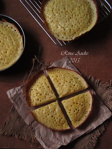 - Panaskan pan anti lengket diameter 16 cm tanpa diolesi minyak/margarin menggunakan api sedang. Tuangkan adonan hingga 1/3 tinggi pan/cetakan, kecilkan apinya seketika supaya tidak gosong. Tekan bagian pinggirnya menggunakan sendok supaya terbentuk lapisan tipis di sisinya. Panggang menggunakan api kecil. Biarkan permukaan martabak berlubang-lubang. taburi gula pasir.