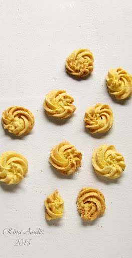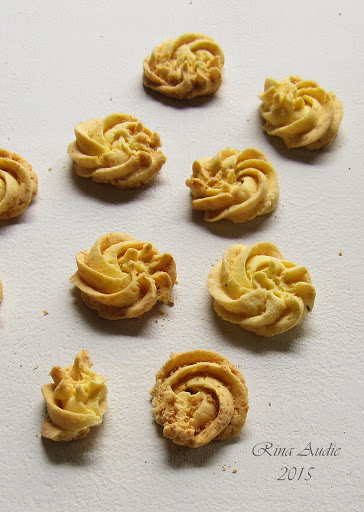 - Masukkan adonan ke dalam kantong segitiga. Beri spuit kerang/bintang ukuran besar. Semprotkan ke atas loyang. Lakukan sampai loyang penuh dan beri jarak di antaranya.
