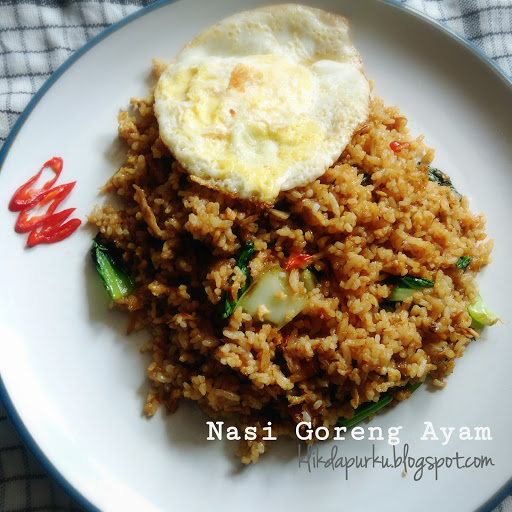 Kali ini aku akan mencoba (tepatnya suamiku... Kalau soal masak nasi goreng udah juara banget rasanya.. 😜) resep nasi goreng ayam, mengingat masih ada ayam goreng sisa ayam kremes yang aku buat kemaren dan tentunya nasi yang kemaren juga 😀